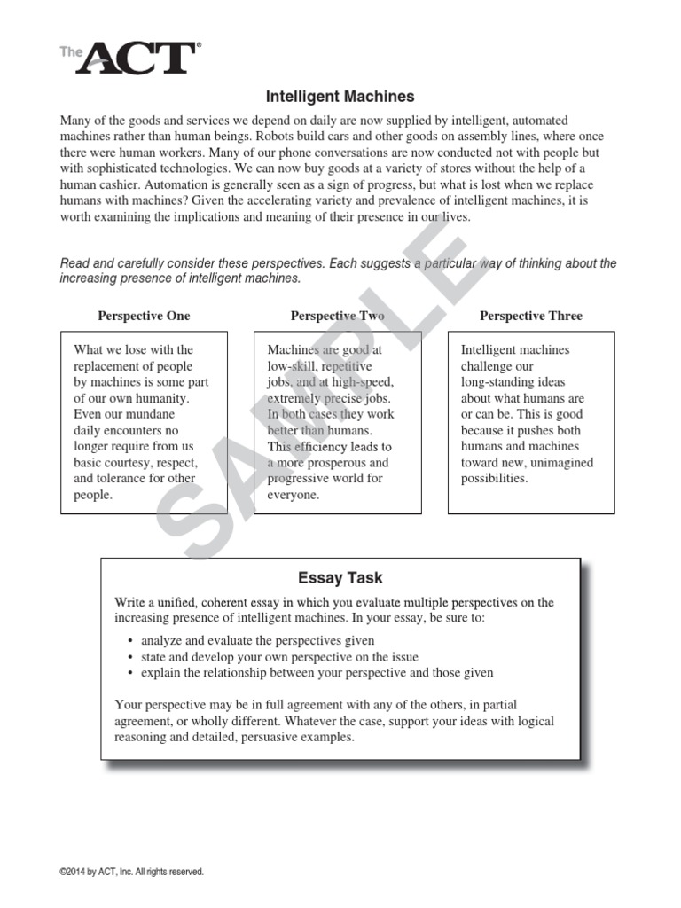 · Free ACT essay samples: This is a list of the best works on the topic ACT, selected especially for you with love from 10,+ works! · For this sample ACT essay, I'm going to tentatively choose to argue Perspective Three (that intelligent machines challenge long-standing ideas about humanity, which in turn pushes humans and machines toward new, previously unimaginable possibilities), simply because that happens to be the position I think I'll be able to support the best ACT Writing Essay Samples. June ACT writing essay sample; December Asia ACT writing essay sample; October ACT writing essay sample; June Asia ACT writing essay sample; December ACT writing essay sample; December ACT Asia writing essay sample; October ACT Asia writing essay sample; September ACT Asia
