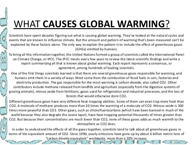 causes an increase in the average of temperature. However global warming are causes by natural events and human that are believed to be contribute to increase in average temperatures.” Main Body Causes of global warming Divided into two categories i.e. natural and human causes 1. Natural causes of global warming It includes greenhouse gases, volcanic eruptions, and the most cited factors that affect global warming are sea saline concentrations, global ice coverage, upper-atmospheric greenhouse gas concentrations, el-nino, weather systems relating to hurricanes and tornado, concentrations of bio matter decomposition, the rate at which greenhouse gasses are produced, winter and summer weather in different · Cause of global warming Almost % of the observed temperature increase over the last 50 years has been due to the increase in the atmosphere of greenhouse gas concentrations like water vapour, carbon dioxide (CO 2), methane and ozone. Greenhouse gases are those gases that contribute to the greenhouse effect (see below)